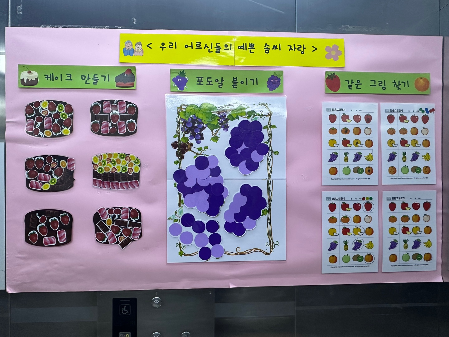 본관 엘리베이터 <우리 어르신들의 예쁜 솜씨 자랑>에 사회복지 프로그램 5월 작품들이 전시되었습니다.