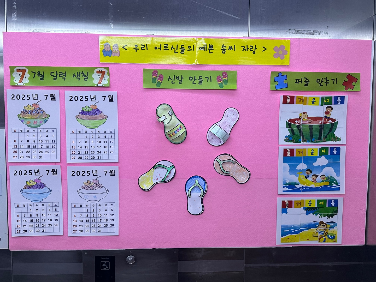 본관 엘리베이터 <우리 어르신들의 예쁜 솜씨 자랑>에 사회복지 프로그램 7월 작품들이 전시되었습니다.
