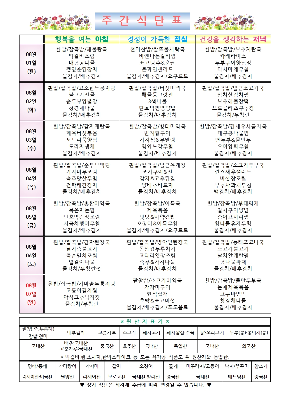 2022년 8월 1주차 식단표