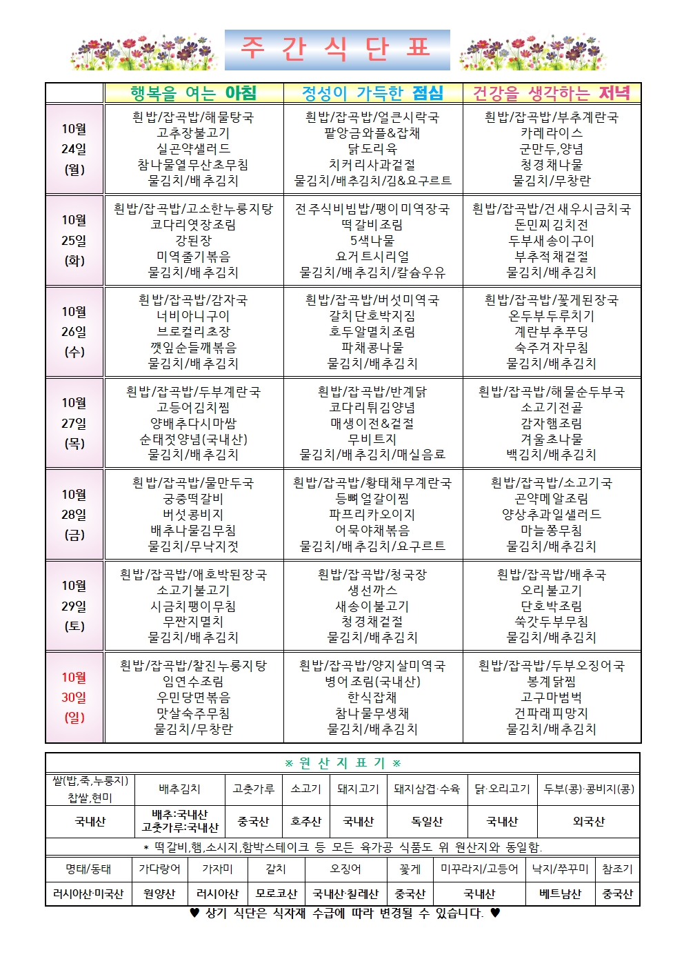 2022년 10월 4주차 식단표