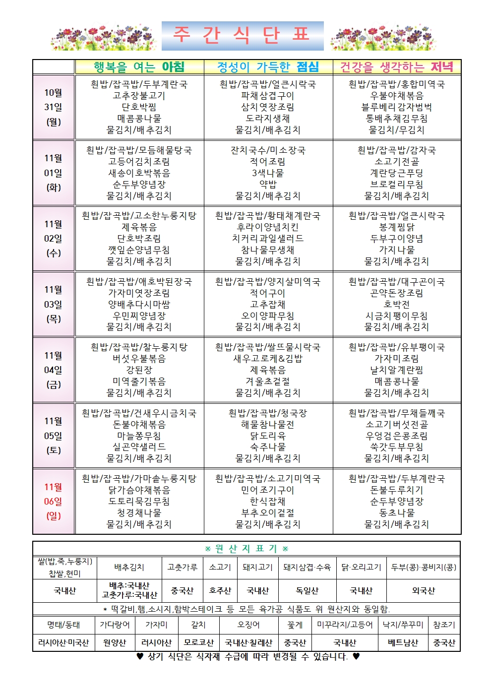 2022년 11월 1주차 식단표