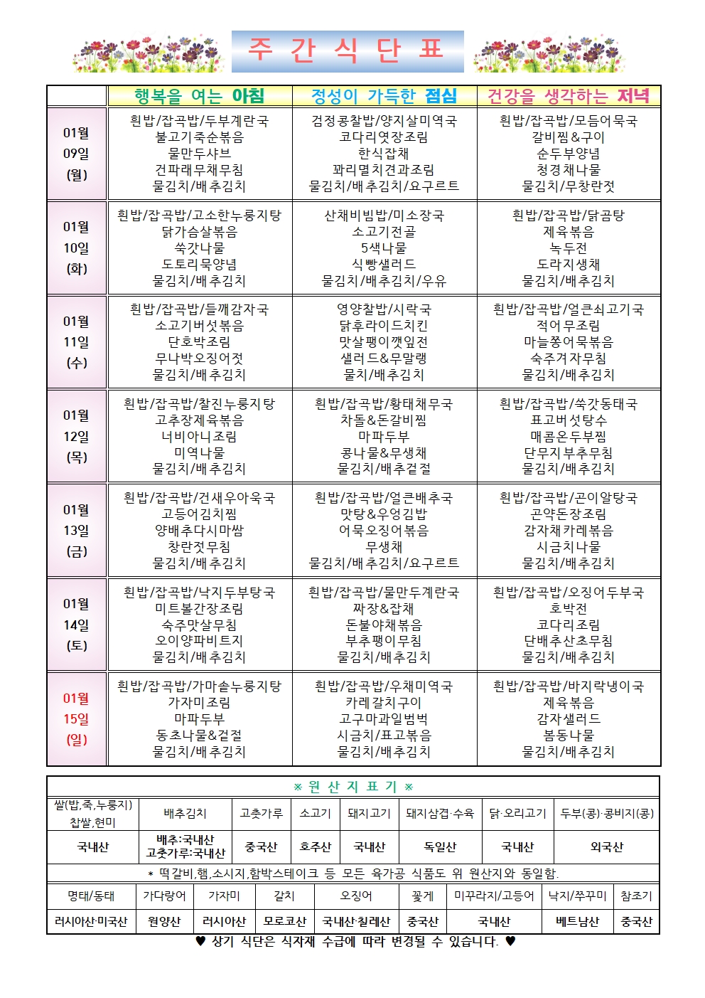2023년 1월 1주차 식단표