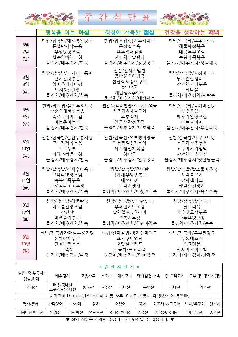 2023년 8월 2주차 식단표