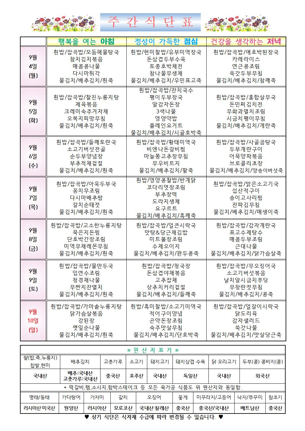 2023년 9월 1주차 식단표