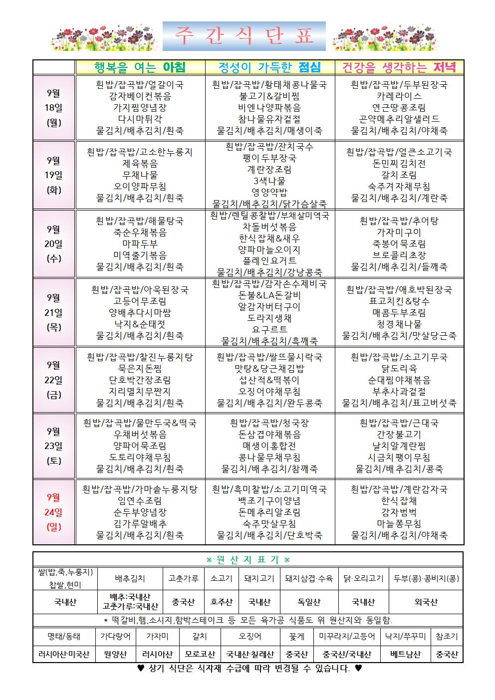 2023년 9월 3주차 식단표